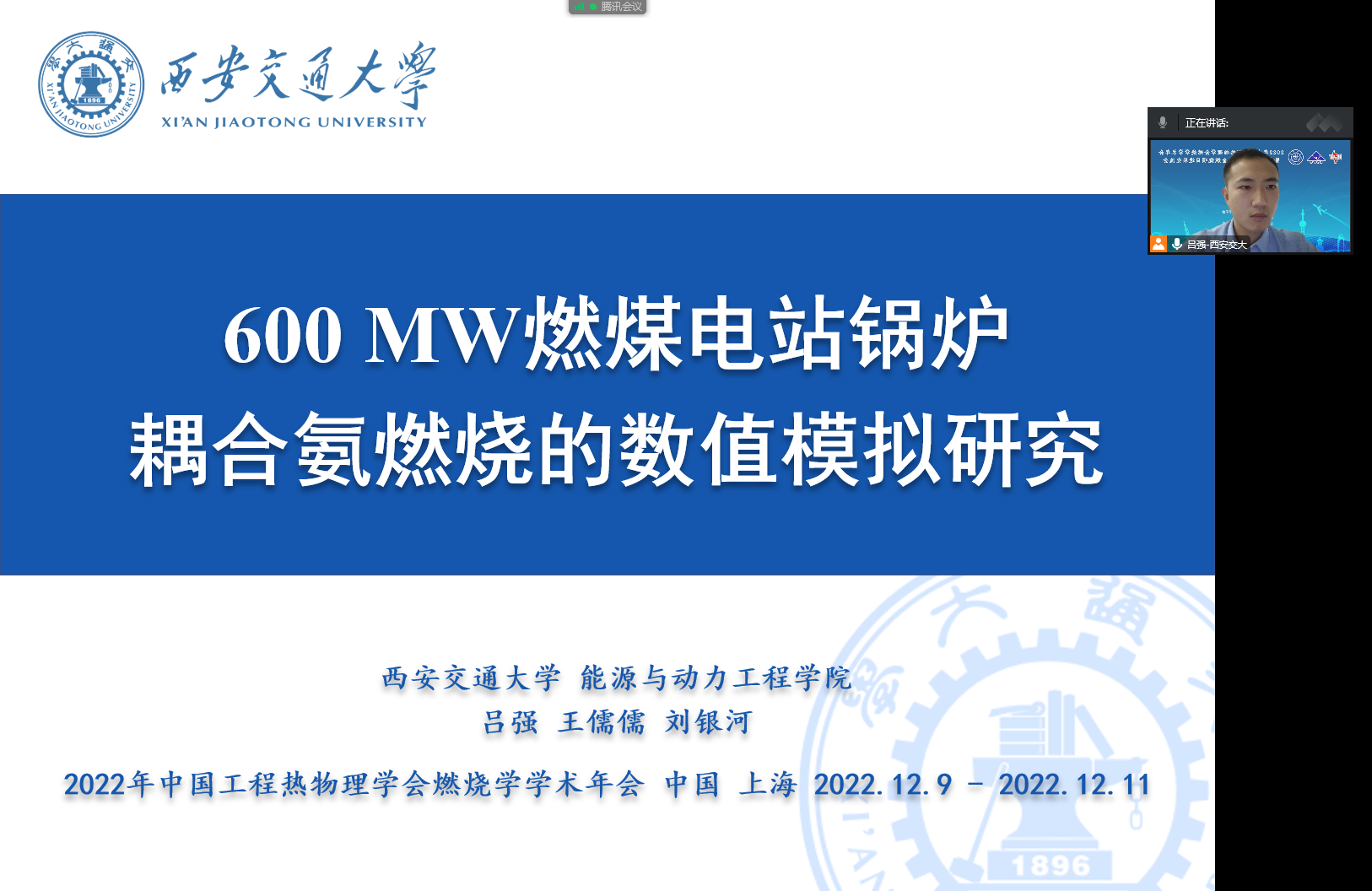 2022年中国工程热物理学会燃烧学学术会议在线召开,在氢及衍生氢燃料研究上,吕强助理教授代表研究小组做了题目为《600 MW燃煤电站锅炉耦合氨燃烧的数值模拟研究》口头报告。