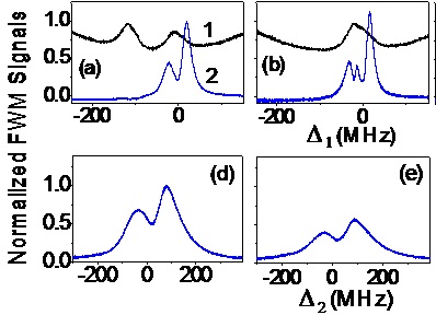 在对多波混频的产生过程调控方面,课题组利用电磁诱导透明 (EIT)现象中不同的吸收和辐射路径之间的量子相消和相涨干涉对其进行有效的调控。也就是利用强的耦合光使原子处于对探测光和多波混频信号的吸收均相消干涉的暗态,从而有效地提高多波混频信号的辐射效率。自从1990年以来,三和四能级原子系统中的EIT已得到了充分的研究。近共振EIT效应导致非常大的由原子相干诱导的三阶非线性,以及小的线性吸收,因而在三和四能级原子系统中导致高效的四波混频(FWM)过程。在典型情形下,高阶非线性系数将远小于低阶非线性系数,达到几个数量级,尤其是在利用连续毫瓦激光功率时,在以前大多数多能级原子系统中,实验上仅能观测到独立的低阶非线性多波混频过程。申请人在通过实现多波混频的共存,相互影响及其慢光现象方面,取得了一系列引人注目的进展。其在实验上首次在气体原子闭合四能级系统和特定的激光束配置下,使FWM和SWM过程以相近的信号幅度共存并能在闭合反V型四能级系统的同一个EIT窗口中共存传输[Appl. Phys. Lett. 91, 221108 (2007); Phys. Rev. A 74, 053813 (2006)]。在国际上,申请人首次在Y型[Zhang et al, Phys. Rev. Lett. 99, 123603 (2007)],反Y型四能级原子系统里,实验上产生出高效率的共存的FWM和SWM;首次在实验上观察到FWM和SWM信号之间的频率干涉[Opt. Lett. 32, 1120 (2007); Phys. Rev. A 73, 053801 (2006)]。申请人率先研究了Y型能级里共存的具有相同信号频率的两个四波混频信号之间由于共用着相同能级的原子相干而发生的强烈的相互竞争 [Appl. Phys. Lett. 91, 061113 (2007)]。其在实验上首次验证了产生于四能级原子系统(如反Y型)中处于同一个EIT窗口中的共存的FWM和SWM之间存在着高效率能量交换,发现它们足够长距离传播后,将分别趋于能量稳定状态[Zhang et al, Phys. Rev. A, Rapid Commun. 77, 061801 (2008)]。在此基础上,申请人进一步研究了低阶和高阶混频信号之间相位控制的时间空间立体干涉实验图谱[Zhang et al, Phys. Rev. Lett. 102, 013601 (2009)];研究了n+1能级原子系统中不同阶的多波混频间的同时共存和相互作用[OE 15, 7182 (2007)]。在复杂的五能级系统中,我们课题组研究了三种双缀饰机制(并联,级联和嵌套缀饰)对FWM的量子调控[Phys. Rev. A 78, 063829 (2008)]。利用EIT对共存的多波混频过程的产生和相互作用的调控,必然会对设计,优化和控制理想的多通道全光非线性器件有很大作用,具有相当重要的科学意义和应用价值。通过EIT研究共存的多波混频之间的相互作用为通过EIT实现多波混频在量子层面上的调控奠定了良好的基础。
