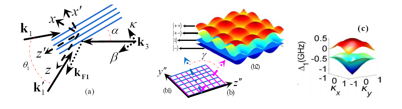(a)电磁诱导光栅EIG,(b)具有二维周期性的(b1)折射率电磁诱导晶格EIL和(b2)电磁诱导能级晶格态,(c)电磁诱导晶格的色散关系