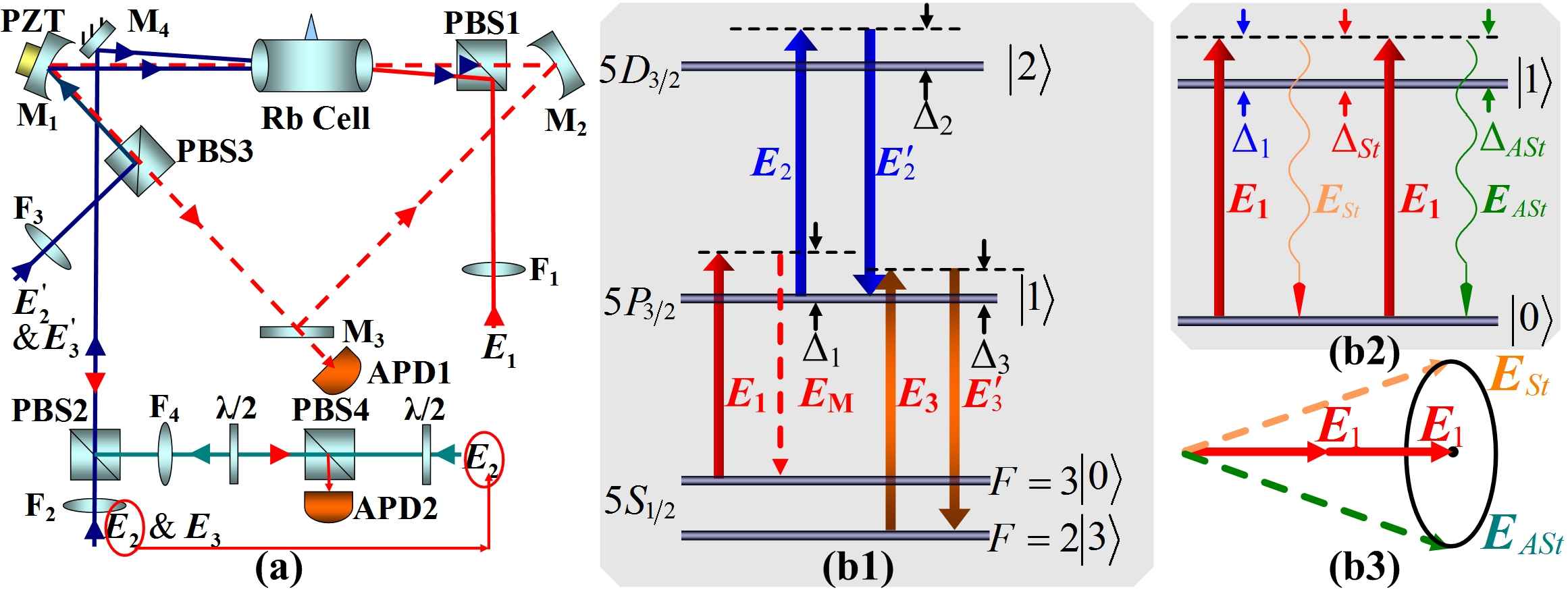 (a) 环形腔多波混频实验光路图,能级图(b1和b2)和空间相位相配过程(b3)