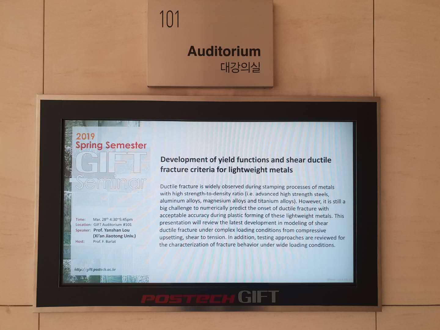 Great honor to give a talk invited by Prof. F. Barlat at GIFT, POSTECH