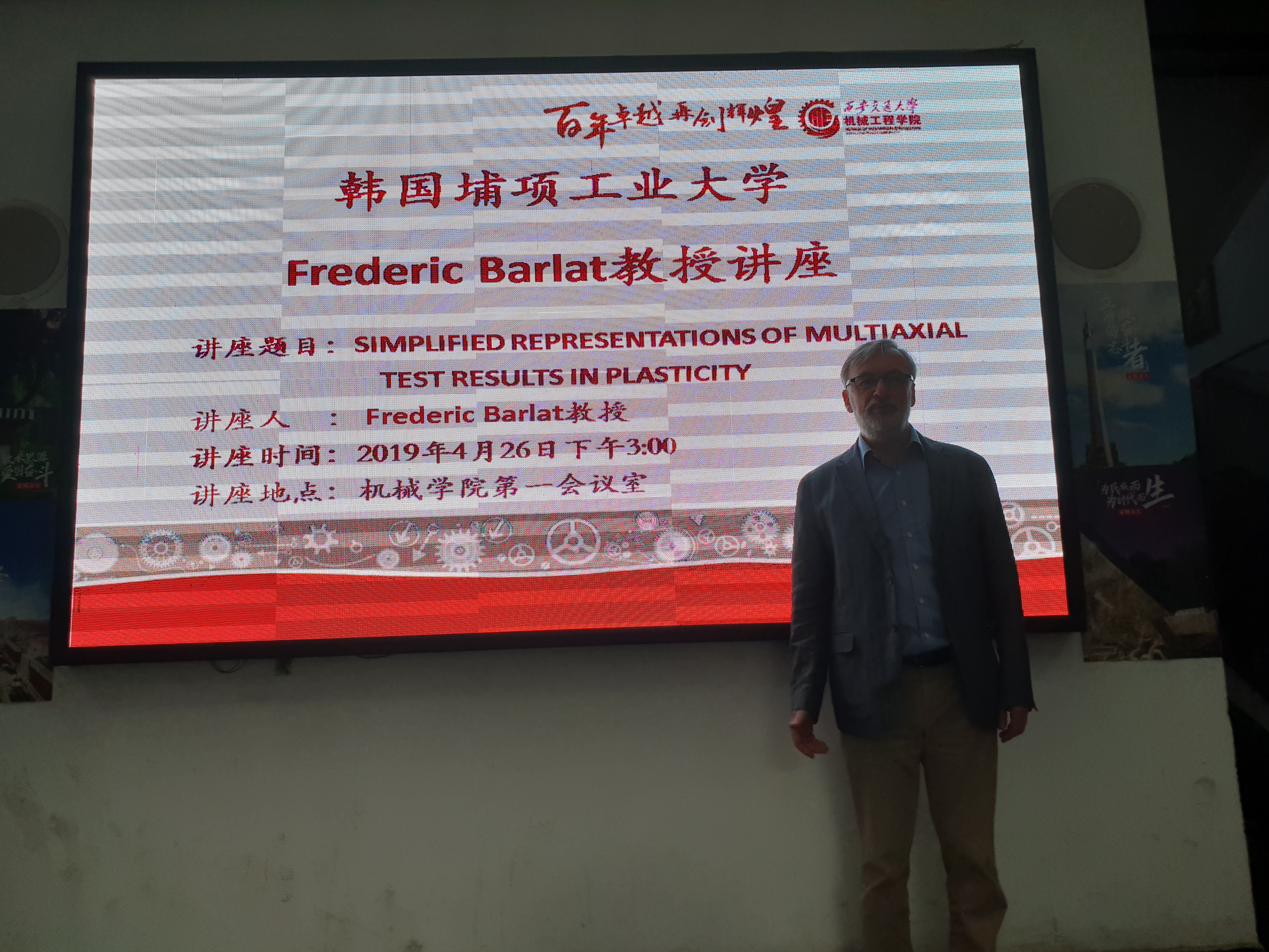 非常荣幸韩国浦项工业大学(POSTECH)黑色金属研究院(GIFT)教授,罗马尼亚荣誉院士F. Barlat教授回访西安交通大学机械学院,并做了非常精彩的邀请报告,介绍了Barlat教授最新的研究成果,且就诸多方面的合作做了初步的探讨。非常感谢学院相关老师的大力帮助和西北工业大学付佳伟老师!