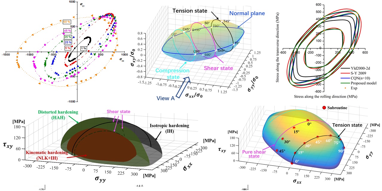 解决超高强度钢、铝合金、钛合金、镁合金等轻质高强难变形金属在塑性变形过程各向异性、拉伸压缩非对称性、包辛格效应、各向异性强化特性等表征难题,实现金属构件在塑性成形及服役过程中塑性变形的精确有限元分析设计