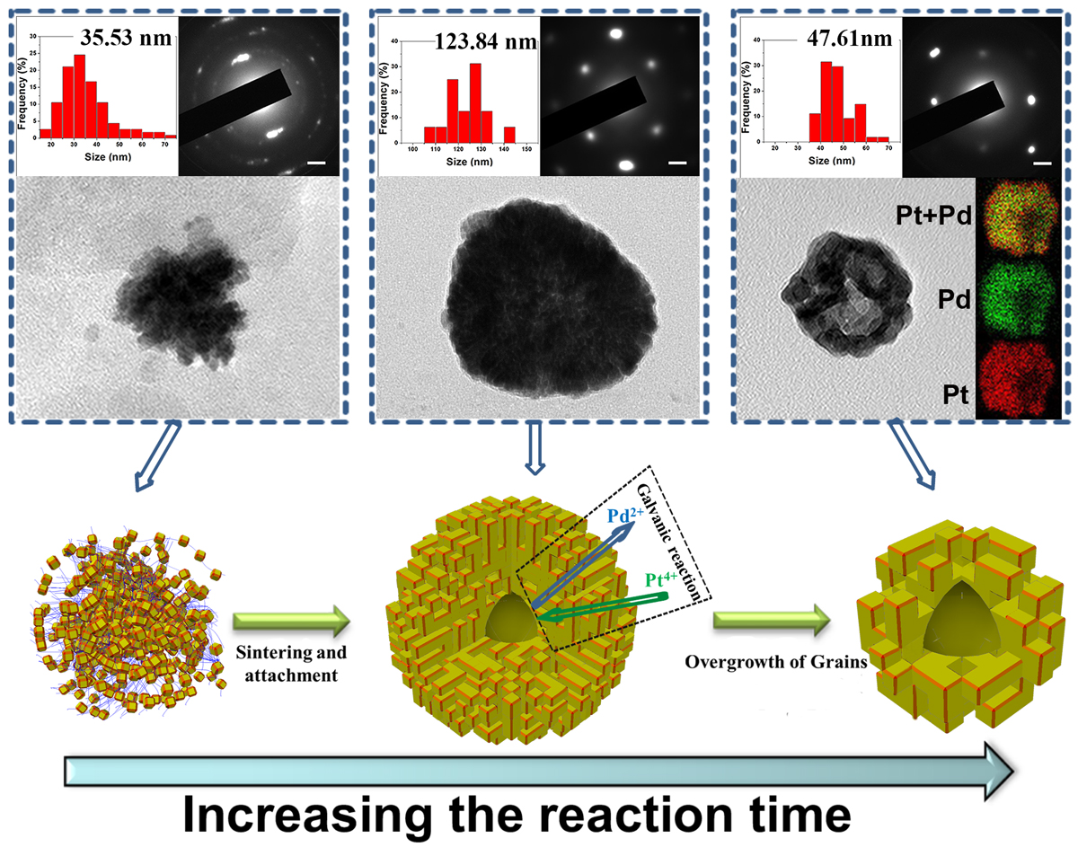 博士研究生邱朋涛论文 Halide ions induced formation of single crystal mesoporous PtPd bimetallic nanoparticles with hollow interior for electrochemical methanol and ethanol oxidation reaction在Nano Research (IF2016= 8.893)发表。该论文主要研究了卤素离子诱导具有空心结构介孔单晶PtPd合金纳米粒子的形成及生长机制,并对其催化性能进行了深入研究。