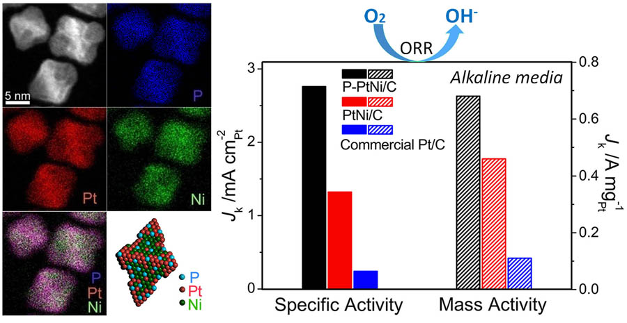博士研究生王珊论文“ Structural and electronic stabilization of PtNi concave octahedral nanoparticles by P doping for oxygen reduction reaction in alkaline electrolytes”(https://pubs.acs.org/doi/abs/10.1021/acsami.8b07742)在知名国际学术期刊ACS Applied Materials & Interfaces发表,该工作系统研究了P掺杂对PtNi合金纳米粒子在碱性条件下氧还原催化反应的影响。研究结果发现,P元素掺杂能够显著提高PtNi合金纳米粒子的电子结构和形态的稳定性,进而有效提高了该催化剂在碱性条件下的ORR催化活性和稳定性。