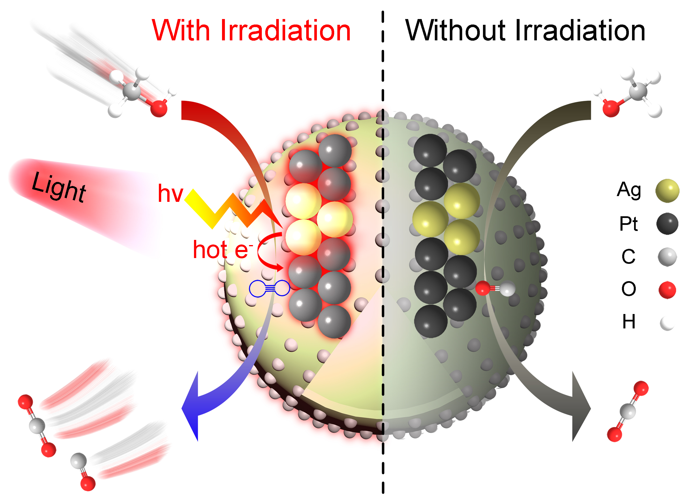The unique bimetallic nanostructures act as both the light absorber and catalytic active site simultaneously, and exhibit enhanced MOR activity in anode oxidation reaction of DMFCs in contrast to the conventional commercial catalysis. The LSPR-induced photothermal effects result in the increased local temperature of AgPt-BHNPs, significantly accelerating the MOR process. Moreover, the surface charge heterogeneity, which is caused by plasmon effects of Ag species, lead to the decrease of the d-band centre character of Pt in AgPt-BHNPs, thus suppressing the absorption of CO during MOR process and enhancing the CO poisoning tolerance property of AgPt-BHNPs. As such, the work will be of general interests to a broad range of researchers in the field of electrocatalysis.
