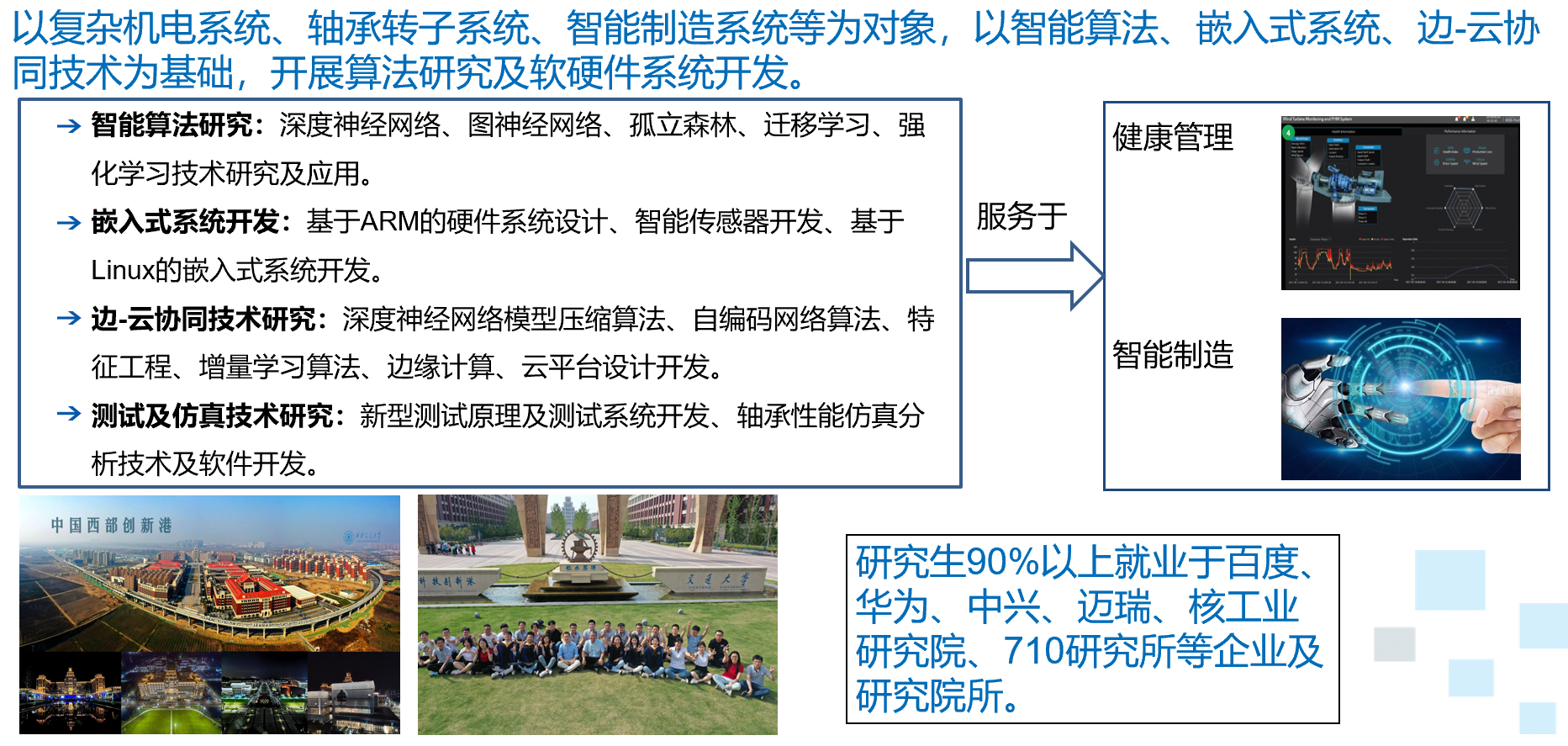 以复杂机电系统、轴承转子系统、智能制造系统等为对象,以智能算法、嵌入式系统、边-云协同技术为基础,开展算法研究及软硬件系统开发。