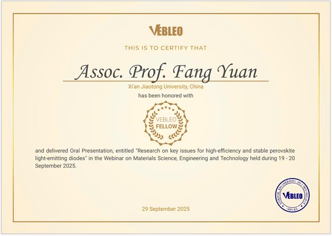 Sometimes the best moments are unplanned!2025年9月30日,被授予国际科学组织VEBLEO协会会士(VEBLEO Fellow),并受邀在VEBLEO大会上做主题为“Research on key issues for high-efficiency and stable perovskite light-emitting diodes”的口头报告(Oral Presentation)。
