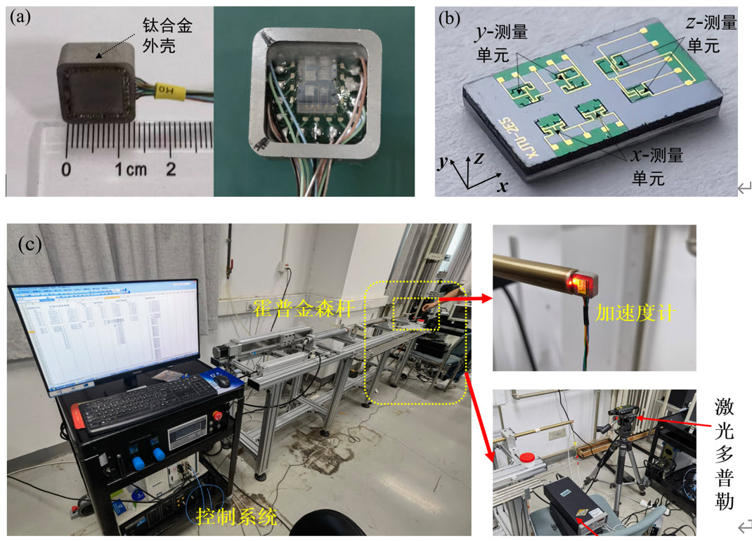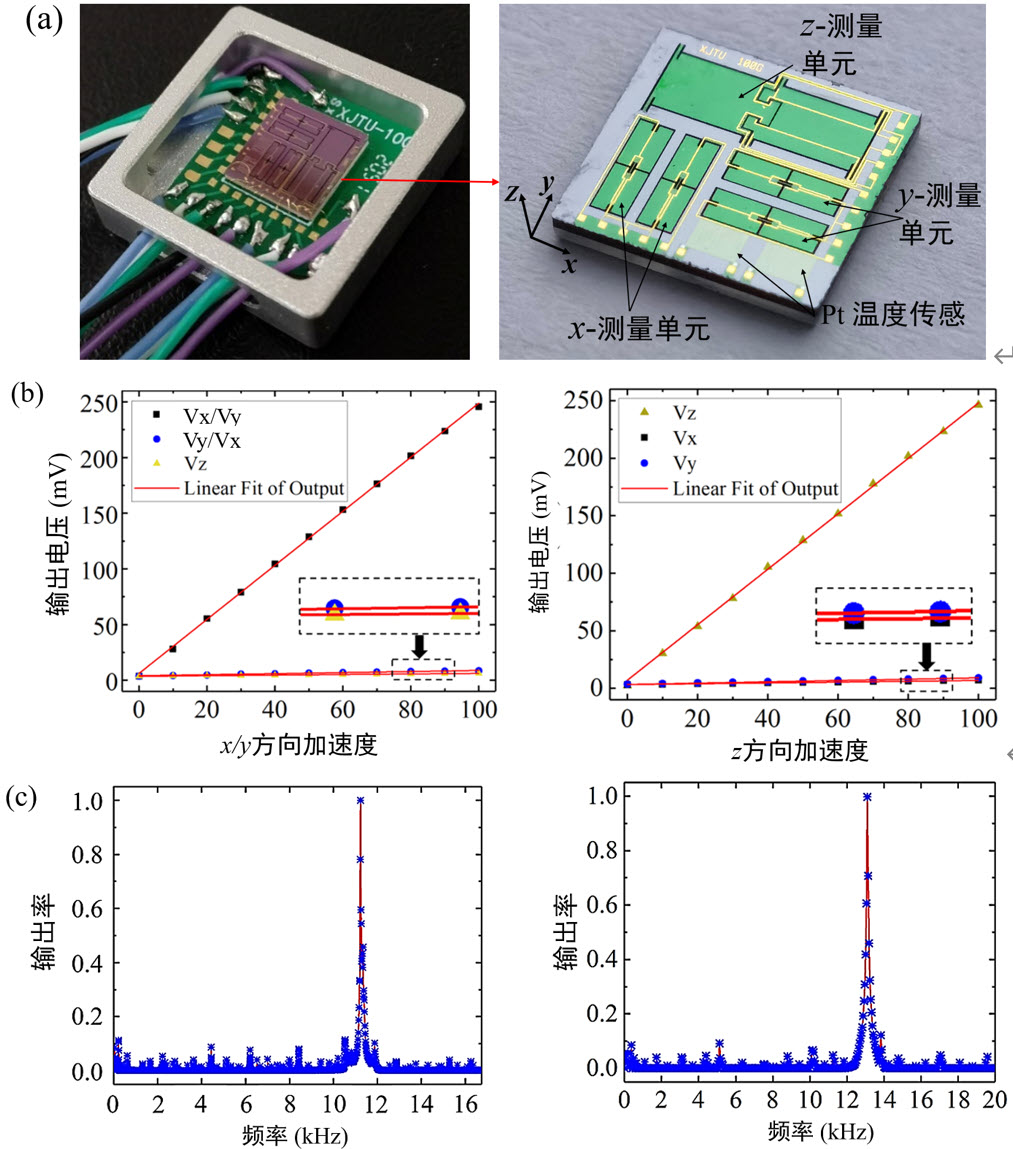 针对国家智能高铁对传感器提出的新型测量需求,和目前传感器核心元件仍高度依赖进口的现状,开展针对高铁转向架温振复合测量的研究,提出了基于压阻梁纯轴向变形的MEMS温振集成传感器芯片,如图5(a)所示。突破了压阻梁与位置无关的纯轴向变形理论,质量块新型互锁结构,单片集成三轴加速度测量及信号解耦机理等关键技术。设计并优化温振复合敏感芯片的制备工艺流程,分析关键制备工艺参数对传感器敏感性能的影响规律;分析了制备工艺过程产生的残余应力及其对传感器稳定性的影响,制备了稳定可靠的温振复合敏感芯片。经过测试和标定,实现了0~100g三轴压阻式加速度芯片的国际最高灵敏度,如图5(b、c)所示,三轴灵敏度均大于2.4 mV/g/5V,三轴固有频率均大于11 kHz。该研究相关成果发表在顶级期刊IEEE Transactions on Industrial Electronics(IF=8.162)、Microsystems & Nanoengineering(IF=8.006)和Measurement Science and Technology(IF=2.4)上。