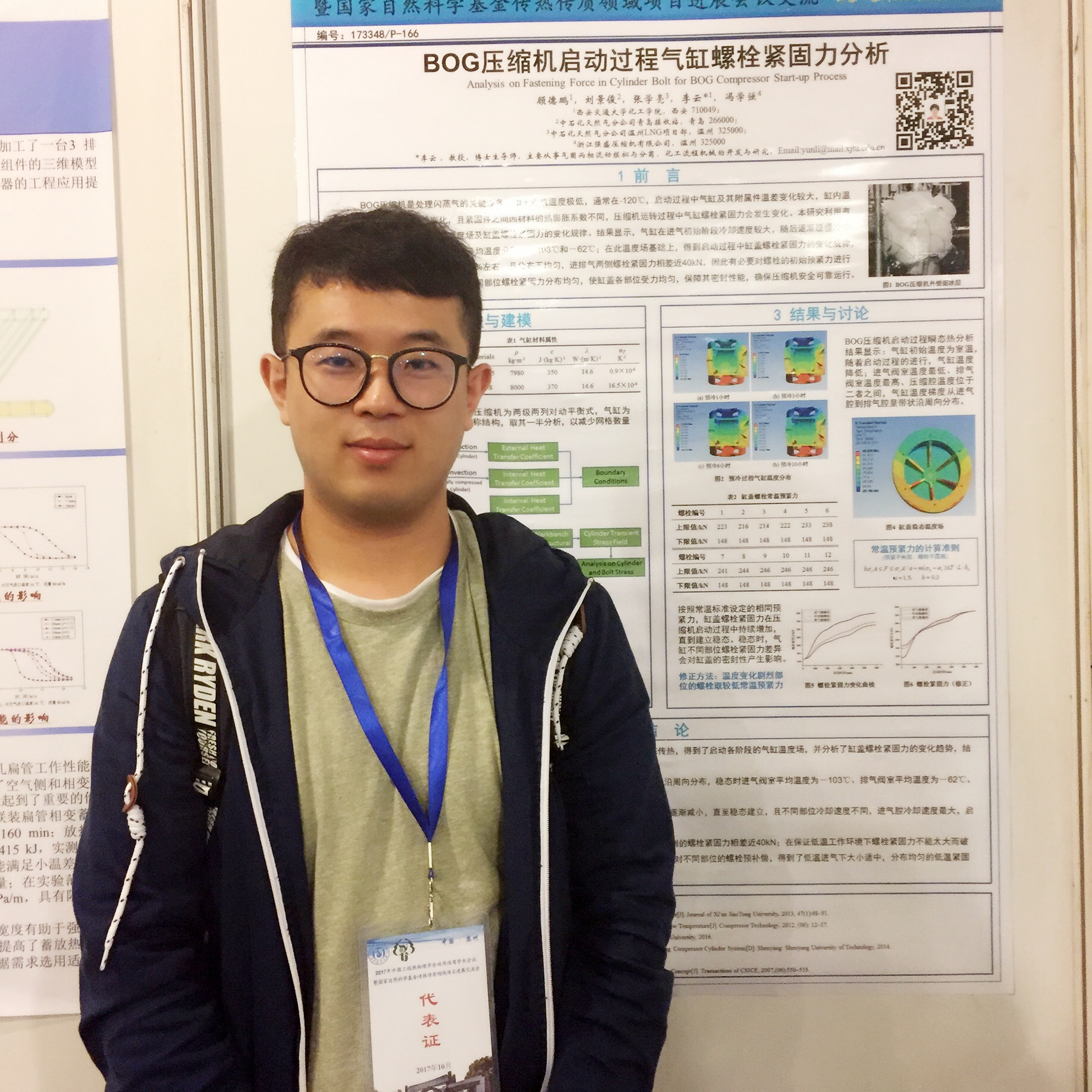 2017年10月27日~30日, “2017年中国工程热物理学会传热传质学学术年会暨国家自然科学基金传热传质领域项目进展交流会议”在苏州市会议中心召开,课题组博士生文孟刚随导师李云教授参加了本次会议。会议期间,课题组研究“BOG压缩机启动过程气缸螺栓紧固力分析”参加了海报论文展示,研究了预冷启动方式下,气缸缸体及螺栓部位的瞬态温度场及应力场的分布,讨论了预设紧固力对极低温下螺栓紧固性能的改善。
