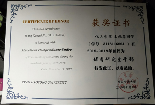 祝贺课题组硕士王旭岑获化工学院2018-2019年度优秀研究生干部称号!