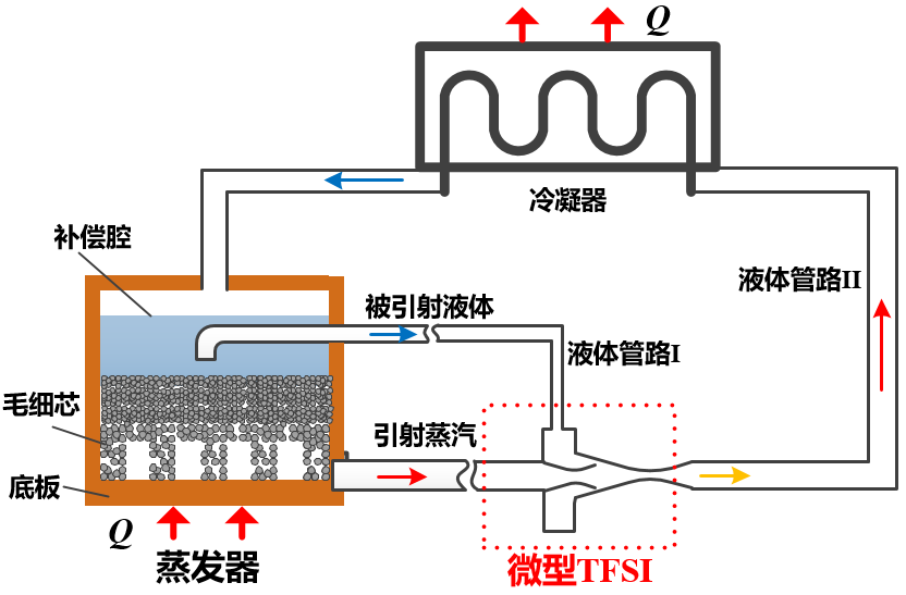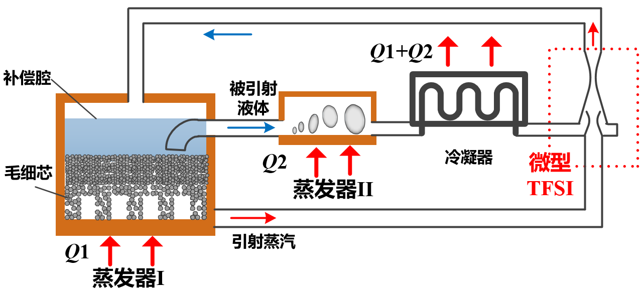 利用微型汽液两相流喷射器(TFSI)“流量放大”和“驱动力放大”原理,解决传统环路热管毛细极限和漏热问题,大幅提高环路热管传热极限和稳定性。