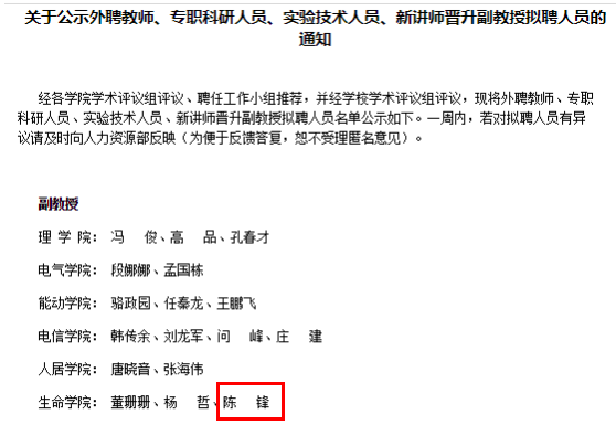 近日,西安交通大学对最新拟聘的高级职务人员名单进行了公示,陈锋博士被学校聘为生命科学与技术学院副教授。在此表示祝贺!