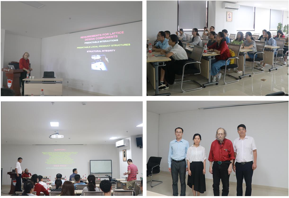 2019年8月30日下午,应生命学院赵永席教授邀请,美国纽约大学化学系杰出教授、美国人文与科学院院士Nadrian C. Seeman 教授访问我院并作题为“DNA is Not Merely the Secret of Life: Semantomorphic Chemistry in Advanced Materials”的学术报告。报告由赵永席教授主持,生命学院、材料学院、机械学院以及基础医学部等各单位教师及研究生聆听了报告。