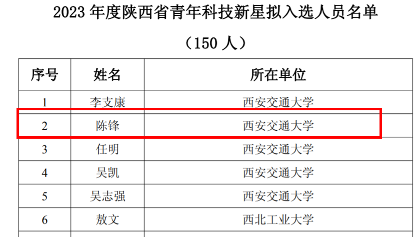 祝贺课题组陈锋教授入选“2023年度陕西省青年科技新星”