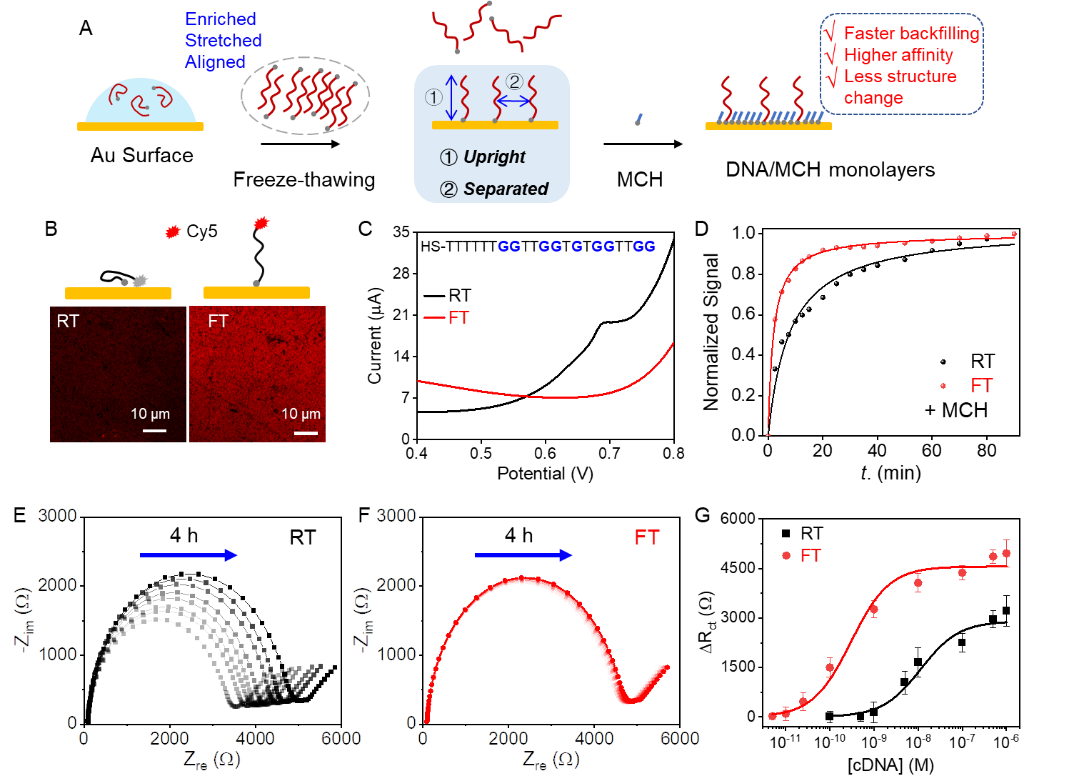 巯基小分子(如6-巯基己醇,MCH)常作为回填剂用来调控金表面DNA的构象。然而,前期研究表明,常规方法室温下制备的DNA分子层,在引入MCH后容易发生结构重排,导致传感性能差,难以重复。作者发现,通过冷冻形成的DNA自组装层高度均一,可有效消除电化学阻抗谱测量中的背景信号偏移问题,表现出优异的批间一致性和长期稳定性。此外,冷冻定向组装的DNA传感界面在复杂生物样本中具有更高的稳定性。