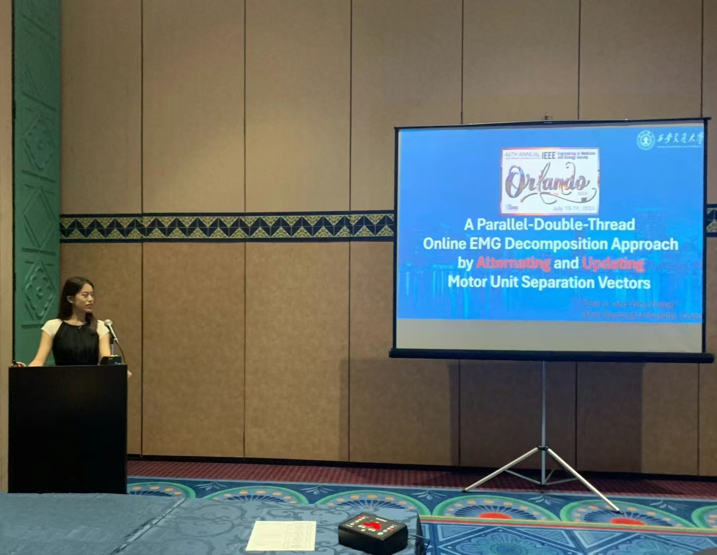 2024年7月15日至19日,第四十六届EMBC 会议(The 46th Annual International Conference of the lEEE Engineering in Medicine and Biology Society)在美国佛罗里达州奥兰多举行,会议主题为“技术及其对公平和健康的承诺”。课题组博士研究生李怡欣的论文" A Parallel-Double-Thread Online EMG Decomposition Approach by Alternating and Updating Motor Unit Separation Vectors "被会议收录,并在会议分会场中进行了口头演讲。