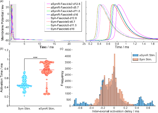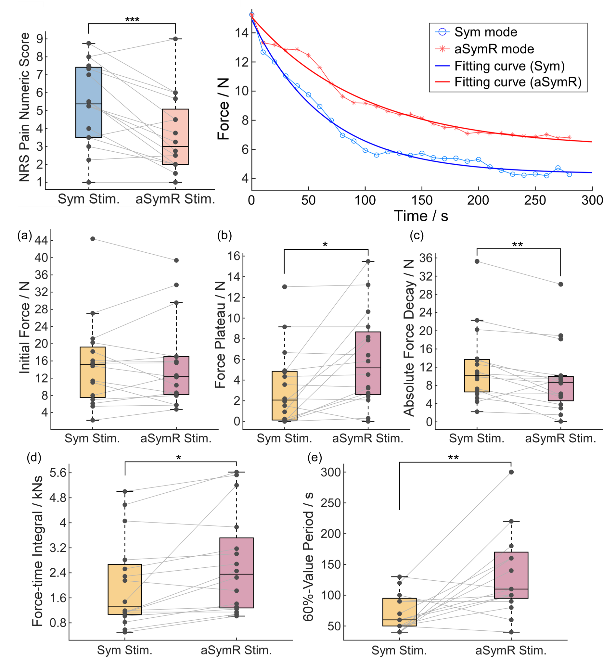该研究通过建模仿真和电刺激疲劳实验对所提aSymR刺激波形进行了验证。实验结果表明,与Sym刺激相比,aSymR刺激显著减轻疼痛(t(15) = 4.13, p = 0.0009),肌肉疲劳显著缓解,具体表现为力量衰减速率较慢(t(15) = 3.667, p = 0.0023)、平台力量较大(t(15) = 2.72, p = 0.0158)、绝对力量衰减较少(t(15) = 3.288, p = 0.005),最终力量输出更大(t(15) = 2.777, p = 0.0141)。此外,仿真结果显示,aSymR刺激显著延迟了不同纤维达到阈值的时间(t(299) = 37.78, p < 0.0001),表明aSymR刺激条件下不同肌肉纤维的激活异步性较高。