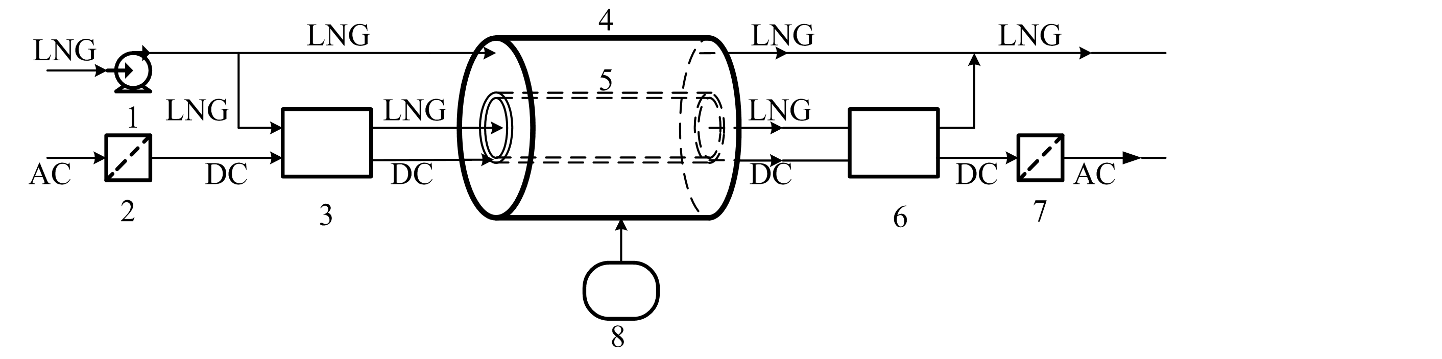 1 – LNG泵; 2, 7 – 交直流转化站; 3, 6 – 超导线缆终端长; 4 – LNG输送管; 5 – 超导电缆; 8 – 低温制冷及加压站。