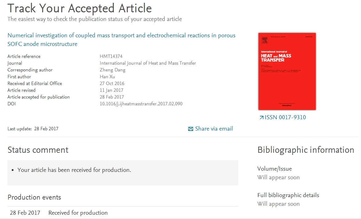 日前接收到国际期刊InternationalJournal of Heat and Mass Transfer主编郑平院士的邮件通知, 本组徐晗博士与党政老师共同完成的一篇关于SOFC 多孔电极内部组分传输机理研究的研究论文被接受发表, InternationalJournal of Heat and Mass Transfer是国际传热传质领域的顶级期刊,其主编均为世界各国传热传质领域的顶级科学家,如郑平院士、陶文铨院士、京都大学吉田英生教授均为其现任主编之一,原国际传热传质中心执行主席、日本传热学会会长铃木健二郎教授(Prof. Kenjiro Suzuki )生前也是该期刊主编之一。