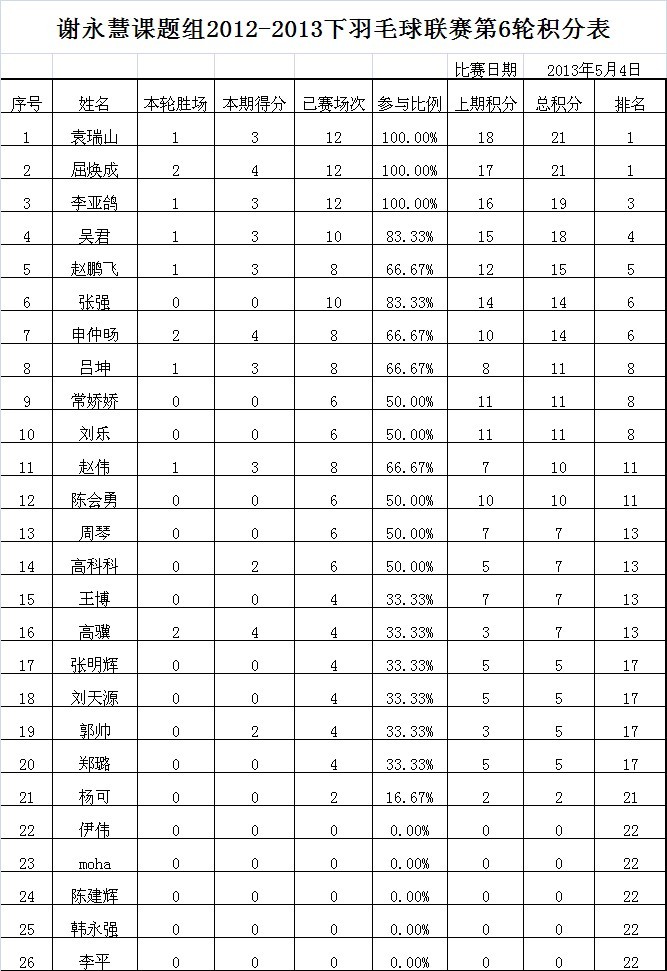 - 文章标题:课题组第三届羽毛球联赛第6轮结果公告