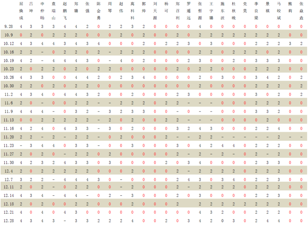 注:排位赛中每组第一名计4分,第二名计3分,第三名计2分;只要参加练习赛就计2分;缺勤计0分;“-”表示请假