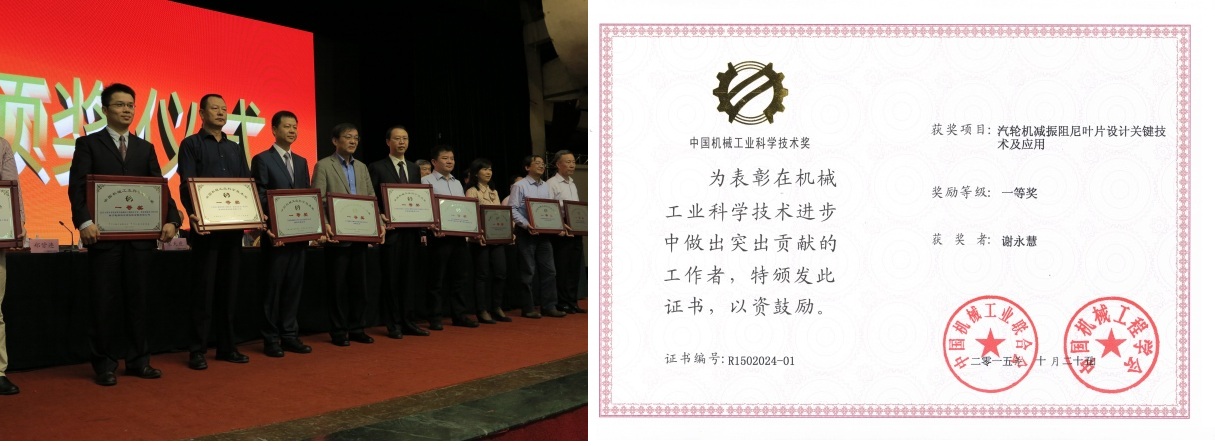 2015中国机械工程学会年会11月20日在广西南宁开幕,中国工程院院长周济出席并致辞。会上颁发了2015年度中国机械工业科学技术奖,由谢永慧教授领衔,西安交通大学、上海发电设备成套设计研究院、东方汽轮机有限公司、上海汽轮机厂、哈尔滨汽轮机厂有限责任公司、杭州汽轮机股份有限公司共同完成的“汽轮机减振阻尼叶片设计关键技术及应用”项目获得中国机械工业科学技术奖一等奖。
