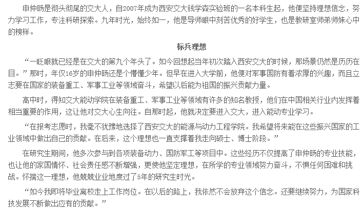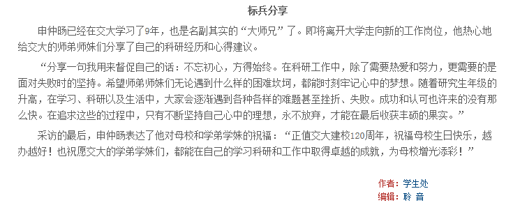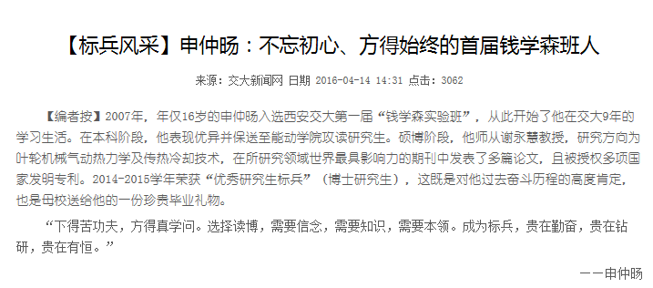4月14日,交大新闻网发布标题为“【标兵风采】申仲旸:不忘初心、方得始终的首届钱学森班人”的新闻。申仲旸同学为团队博士研究生,师从谢永慧教授,2015年12月获得“优秀研究生标兵”(博士研究生)称号,在此表示热烈祝贺。新闻链接:http://news.xjtu.edu.cn/info/1033/64103.htm。