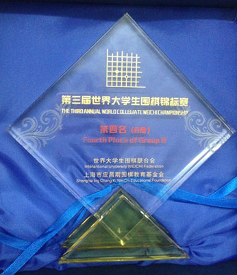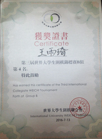 2016年7月7日至7月13日,第三届世界大学生围棋锦标赛在加拿大多伦多大学落下帷幕,本届比赛共有来自世界各地70所著名大学的102名大学生棋手参加。本团队研究生王雨琦同学自幼学习围棋,展现出良好的兴趣与天赋,在本次比赛中,王雨琦同学发挥出色,奋勇拼搏,作为首次参加世界级大学生比赛的新人,面对世界各地的围棋高手,登场豪取四连胜,最终获得B组第四名的好成绩。愿王雨琦同学将围棋的所感所得融入科研生活中,在未来的研究生生活中取得更多的科研成果。