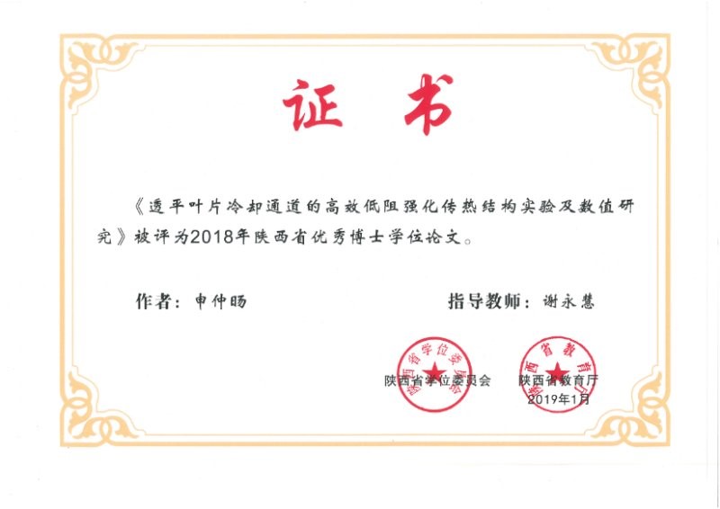 2016年团队毕业研究生申仲旸的博士论文《透平叶片冷却通道的高效低阻强化传热结构实验及数值研究》被评选为2018年度“陕西省优秀博士学位论文”。该论文采用实验及数值分析方法,对透平叶片典型冷却通道中布置球窝/球凸及组合结构的流动、传热及阻力特性进行了深入研究,内容写作详实,工作量饱满,创新性显著,对于实际应用中透平叶片低阻高效强化换热具有重要参考价值。