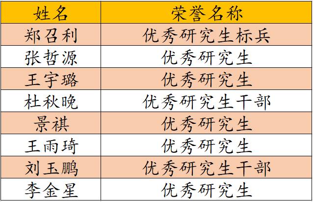 本次评定中,共有9人次获得多项奖学金,其中国家奖学金4人,社会及行业奖学金5人。共有8人次获得多种荣誉称号,其中包括校级最高荣誉“优秀研究生标兵”1人、“优秀研究生标兵”2人以及“优秀研究生”5人。