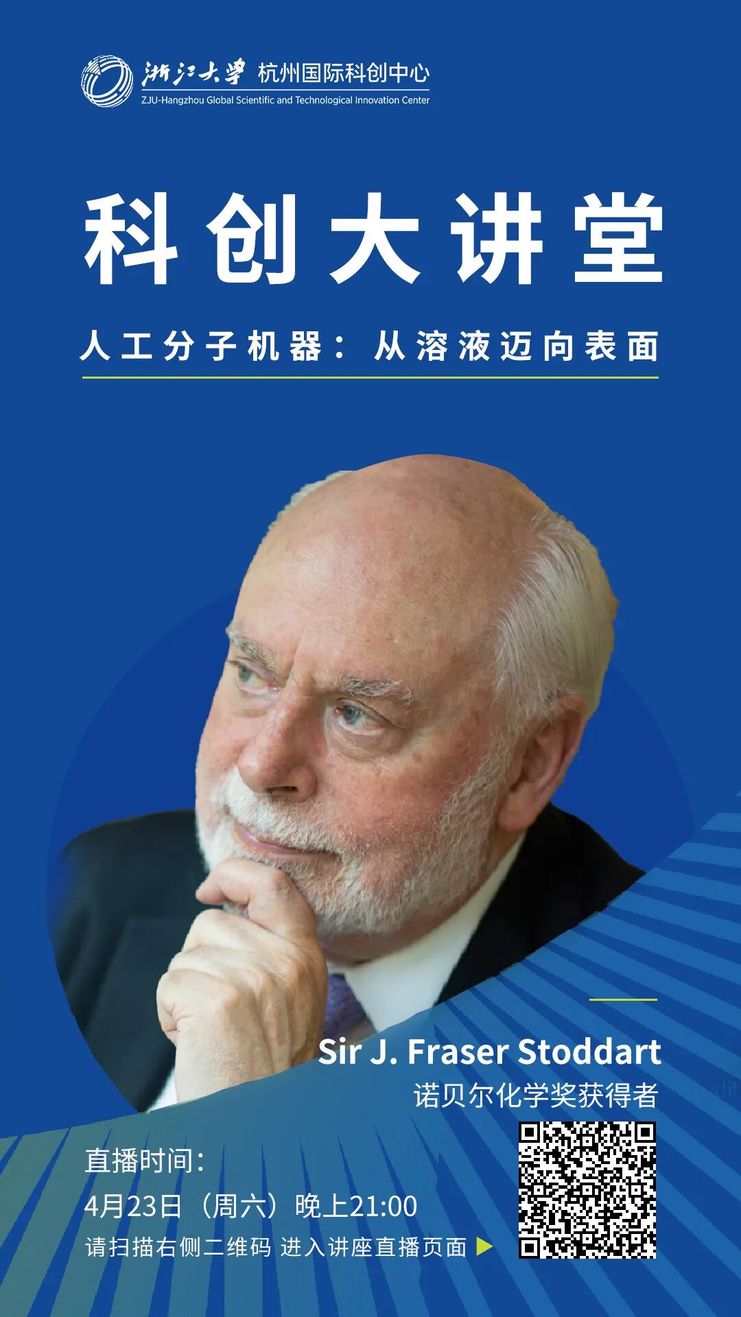 J. Fraser Stoddart是有机超分子化学和纳米科学领域最杰出的科学家之一。2016年诺贝尔化学奖获得者。Stoddart教授是机械互锁型分子及分子机器领域的创始人和重要奠基人,迄今已经在《Nature》《Science》等重要杂志发表论文1250余篇,所发表的科研论文在全球范围内被引用达5万余次。Stoddart教授的研究成果引起了全球广泛关注,获得100余项国际奖项和荣誉,其中包括1978年由化学学会颁发的Carbohydrate Chemistry Award,1994年获得International Izatt-Christensen Award,1999年美国化学学会颁发的Arthur C. Cope Scholar Award奖。