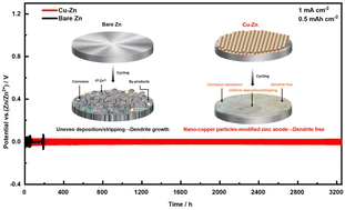 硕士生朱洪川在《A nano-copper particle-modified zinc anode as a protective coating enables dendrite-free aqueous zinc-ion batteries》的工作中,在金属锌负极表面构建一种防腐纳米铜颗粒保护涂层,所制备的纳米铜颗粒均匀地分布在锌表面,提供均匀的电场分布,成功地抑制了锌表面的电化学腐蚀。