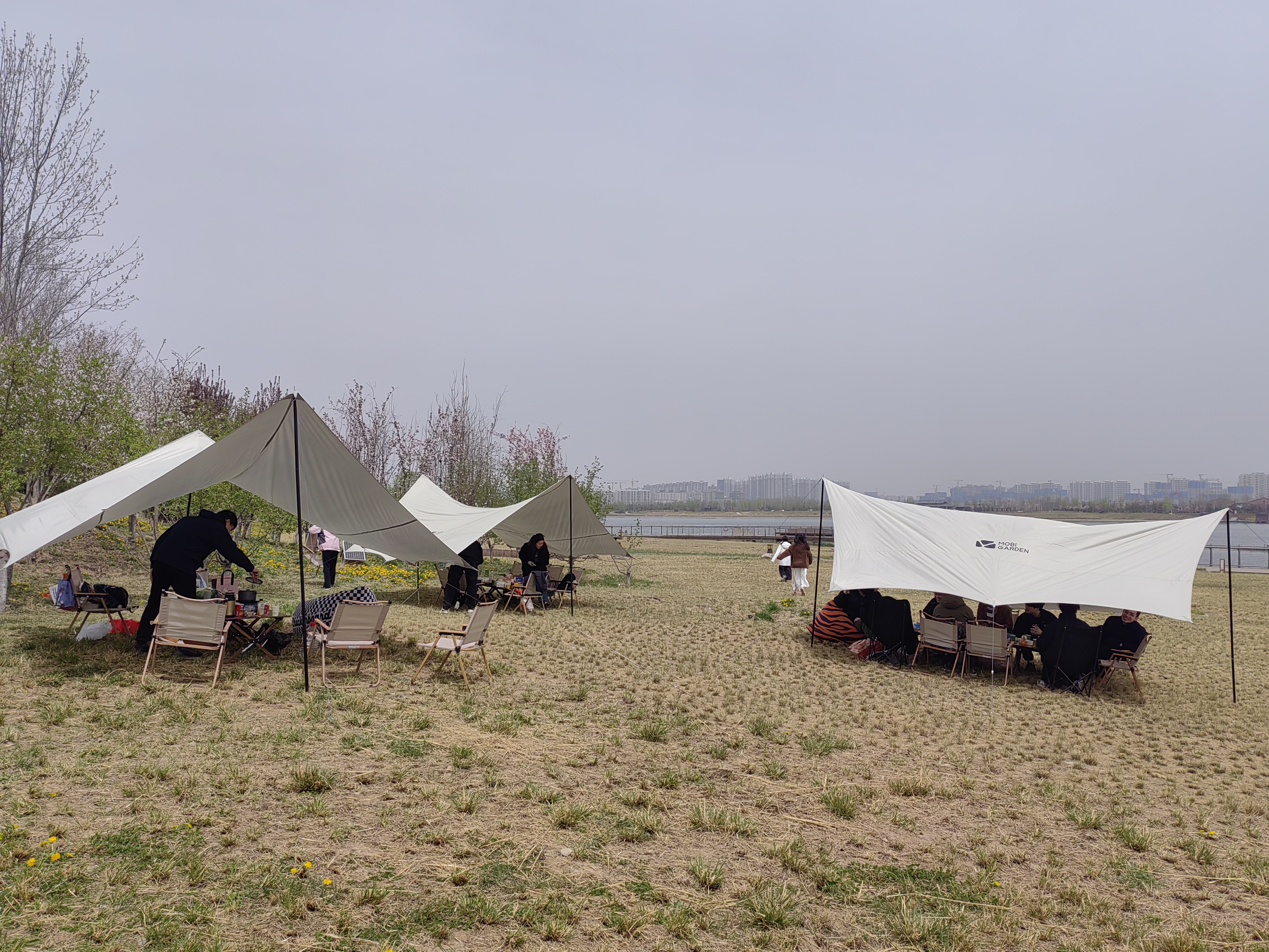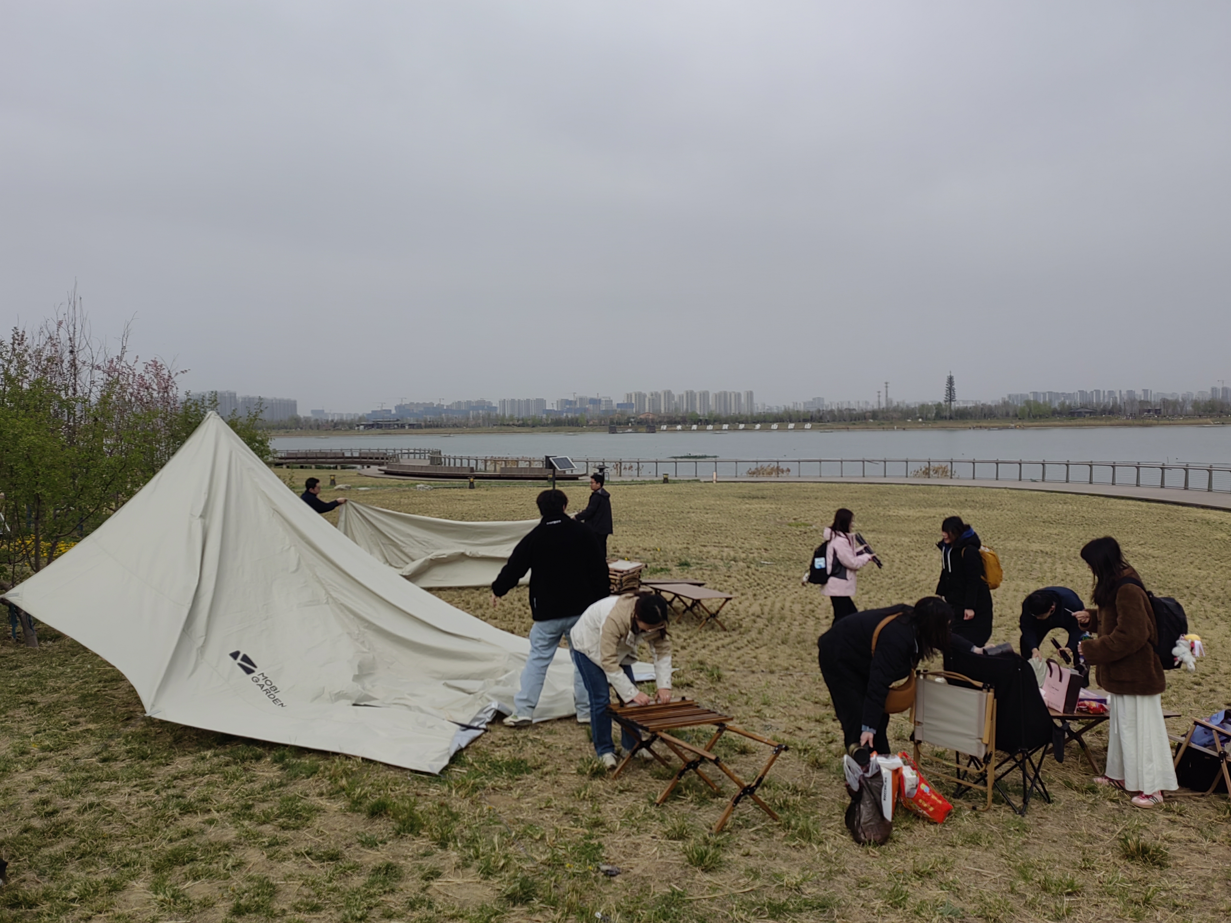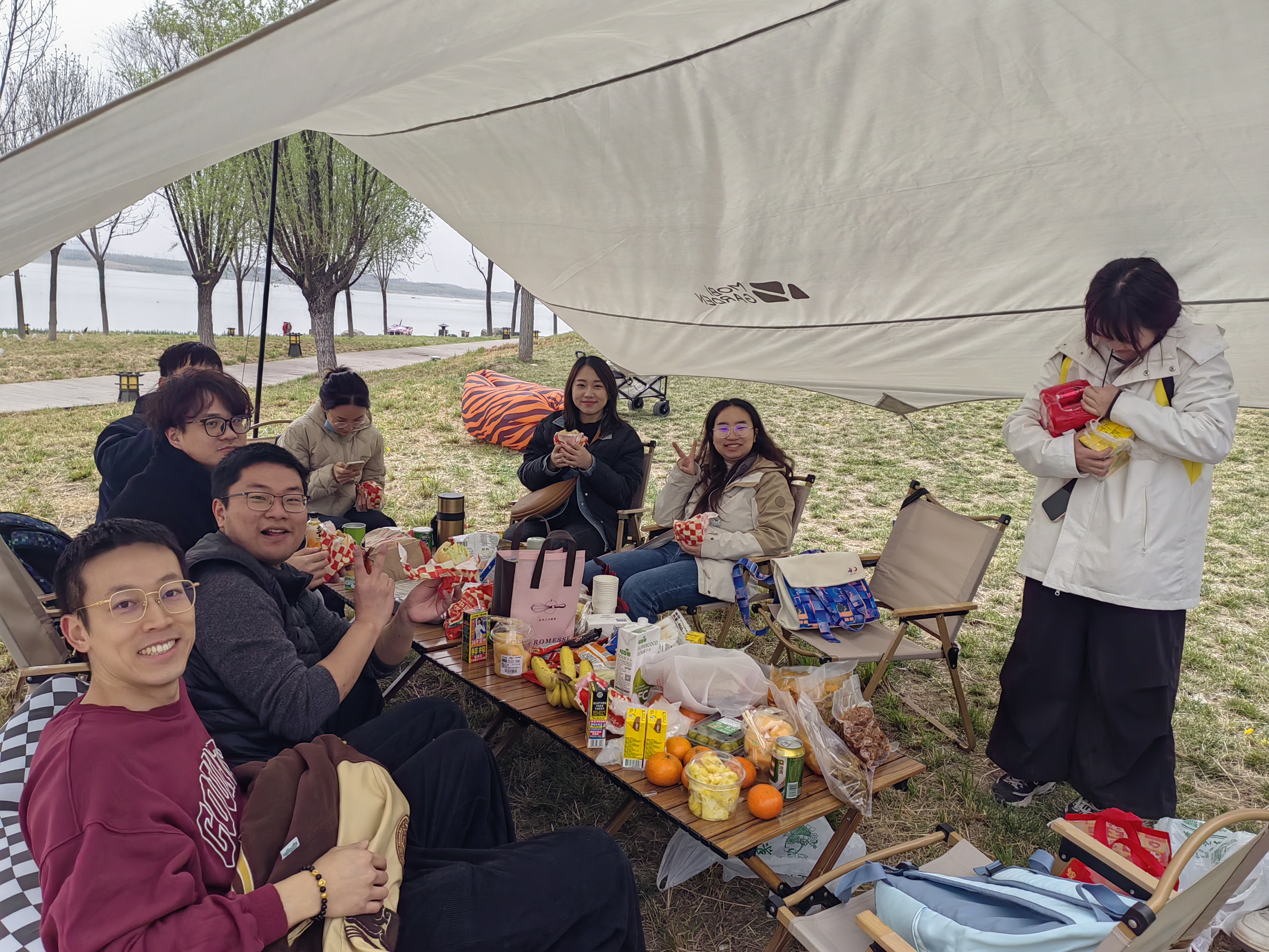 活动当日,团队成员抵达昆明池后迅速分工协作,共同搭建起数顶户外帐篷。蓝天白云下,大家围坐在野餐桌上分享热腾腾的披萨、汉堡等美食,伴着粼粼波光畅谈生活和学习中的趣事,轻松愉悦的午餐时光为后续活动积蓄了满满活力。餐后,成员们自发组成多个兴趣小组:飞盘爱好者们在草坪上展开攻防竞技,奔跑跳跃间尽显青春朝气;桌游组则围绕《狼人杀》等经典游戏展开脑力角逐,此起彼伏的欢笑声与策略讨论声交织成趣。