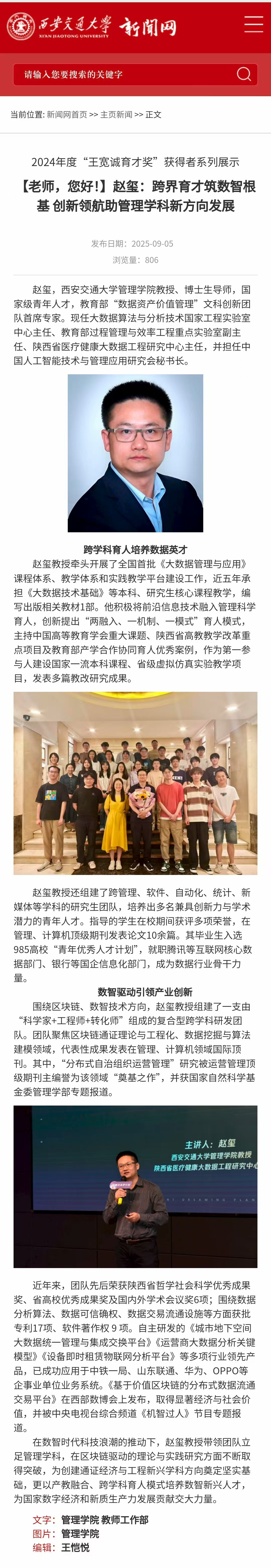 - 西安交通大学新闻网报道:【赵玺:跨界育才筑数智根基 创新领航助管理学科新方向发展】