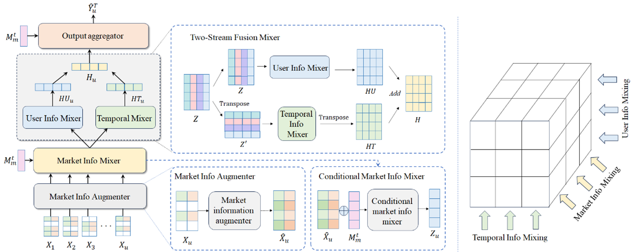 为此,研究团队提出首个基于轻量级多层感知机(MLP)的框架CryptoMixer用于分布式数字通证市场的用户行为预测。该框架创新性融合三大模块:通过市场信息增强器动态聚合异步交易数据,解决稀疏性问题;利用条件市场信息混合器捕捉多维度市场状态与用户行为的复杂关联;设计双流MLP融合网络,从"用户时序"和"时序用户"双视角建模交易动态。实验基于分布式交易所Uniswap真实交易数据集验证,CryptoMixer在预测精度上显著优于传统模型,推理速度可达到毫秒级,为数字通证交易市场的用户行为预测提供高效技术方案。