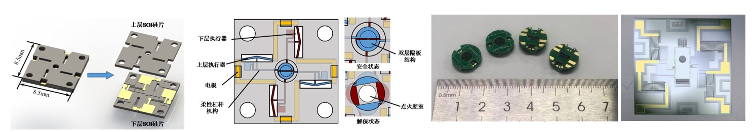 当前位置: 中文主页 >> 研究方向 >> MEMS执行器与火工品在MEMS火工品及相关器件设计方面:针对MEMS火工品结构微型化、功能集成化、控制智能化的发展需求,基于国家安全重大基础研究项目和装发预研重点领域基金项目,开展新型MEMS安保装置的设计、仿真、制作及应用研究,突破了MEMS火工品设计制造关键技术。提出的四隔板驱动器、单隔板驱动器、双向驱动平台可以分别实现500μm、1mm以及2mm的位移输出,并首次实现了MEMS火工品的自主状态切换、状态锁定、状态恢复与状态反馈,为MEMS技术在国家新一代武器装备系统中的研制和应用提供相应的理论和技术支撑。