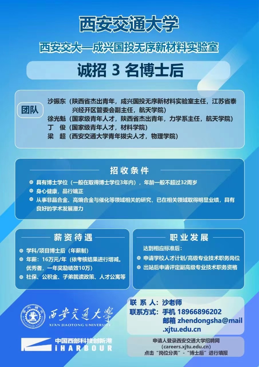 本研究组长期招收与污水处理、血管支架、机器学习和因瓦合金等领域相关的硕士研究生、博士研究生,并热忱欢迎具有非晶合金、高熵合金与催化等相关领域研究经历的博士后,详情见下图。