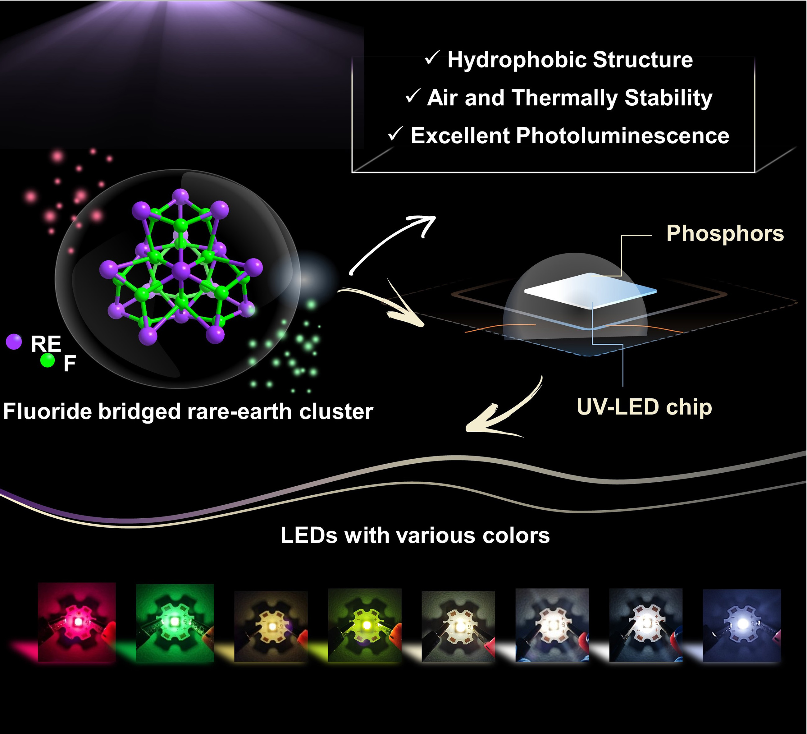 Highlight:氟化物基晶格能够有效减少稀土基发光材料声子猝灭。这里,我们引入了氟离子,并采用“混配体”策略,通过简单的一锅法获得了一类具有纳米尺寸、空气和热稳定性的稀土(RE)团簇晶体RE16(μ4-F)6(μ3-F)12(tBuCOO)18[N(CH2CH2O)3]4 (RE = Eu, EuFC-16;RE = Tb, TbFC-16)。这两种团簇展现出高的量子产率、色纯度、疏水性以及溶解度。作为发光涂层材料,它们在荧光粉转换发光二极管(pc-LED)中具有极大地潜力,封装得到的LED器件展现出高的发光亮度、高的显色指数,可调的色温以及优异的防水能力。