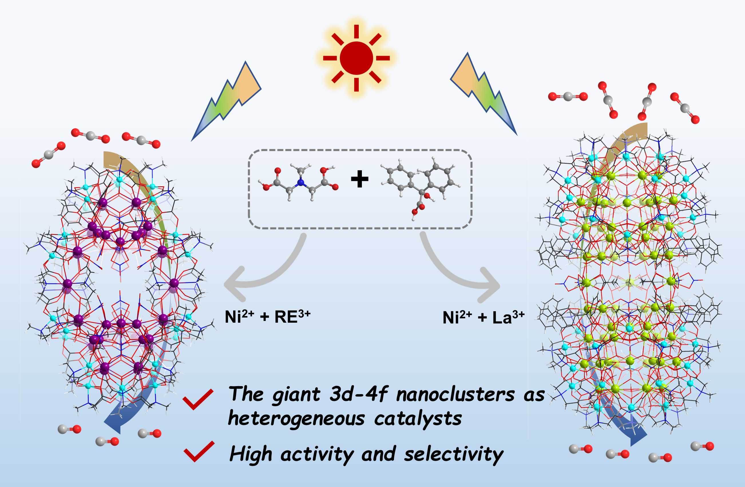 Highlight: 本工作报道了两个分别具有216核(M120RE96或PCC-216MR)和300核(Co144Gd156或PCC-300CG)的过渡-稀土异金属多孔配位团簇(PCCs)家族。对于第一系列团簇,过渡金属M可以是镍或钴,稀土为Pr、Nd、Sm、Eu和Gd;而后者是目前核数最高的过渡-稀土异金属团簇。这些团簇不仅具有中空笼状结构,对N2和CO2表现出一定的吸附能力,而且能够溶解于水溶液及乙腈/甲醇混合溶液中,并保持结构稳定。系列钆基团簇在可见光照射下可作为均相催化剂有效地将CO2转化为CO,其转化数都超过10000,效率优于报道的许多其它催化剂。值得注意的是,PCC-216NG镍催化剂对CO产物的选择性接近100%。该工作为多孔配位团簇催化剂的设计与开发开辟了新的方向。