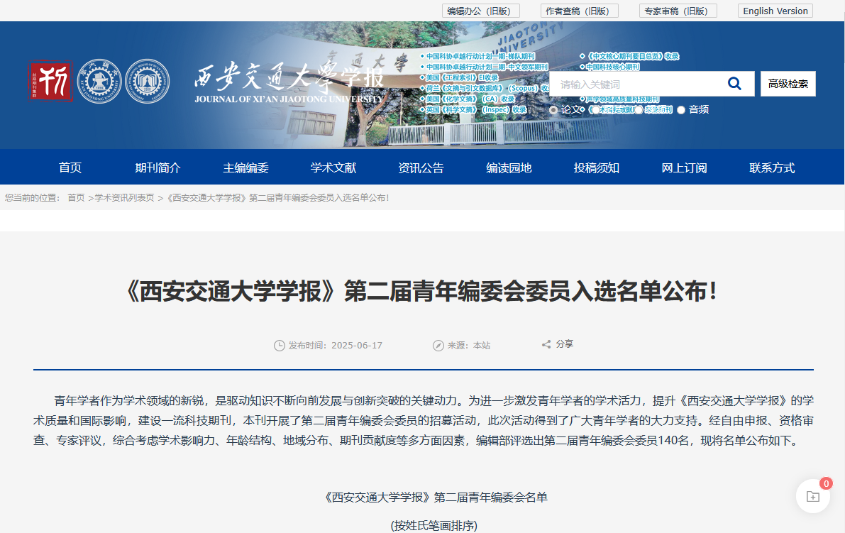 文章标题:菅振入选《西安交通大学学报》第二届青年编委会
