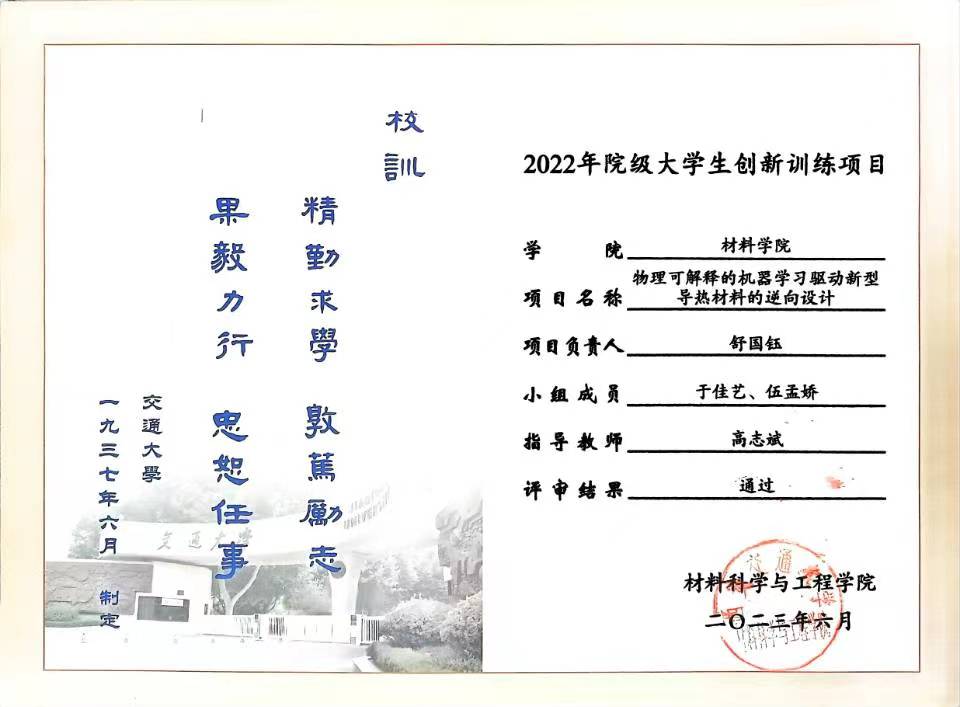 9. 2024年院级大学生创新训练项目顺利结题,项目名称:知识嵌入与数据驱动相融合的材料力学与导热性能高通量实时计算平台开发,项目负责人:郑生智,小组成员:韩忻阳、韩佳泰、田雨泽,指导教师:高志斌,时间:二O二五年六月