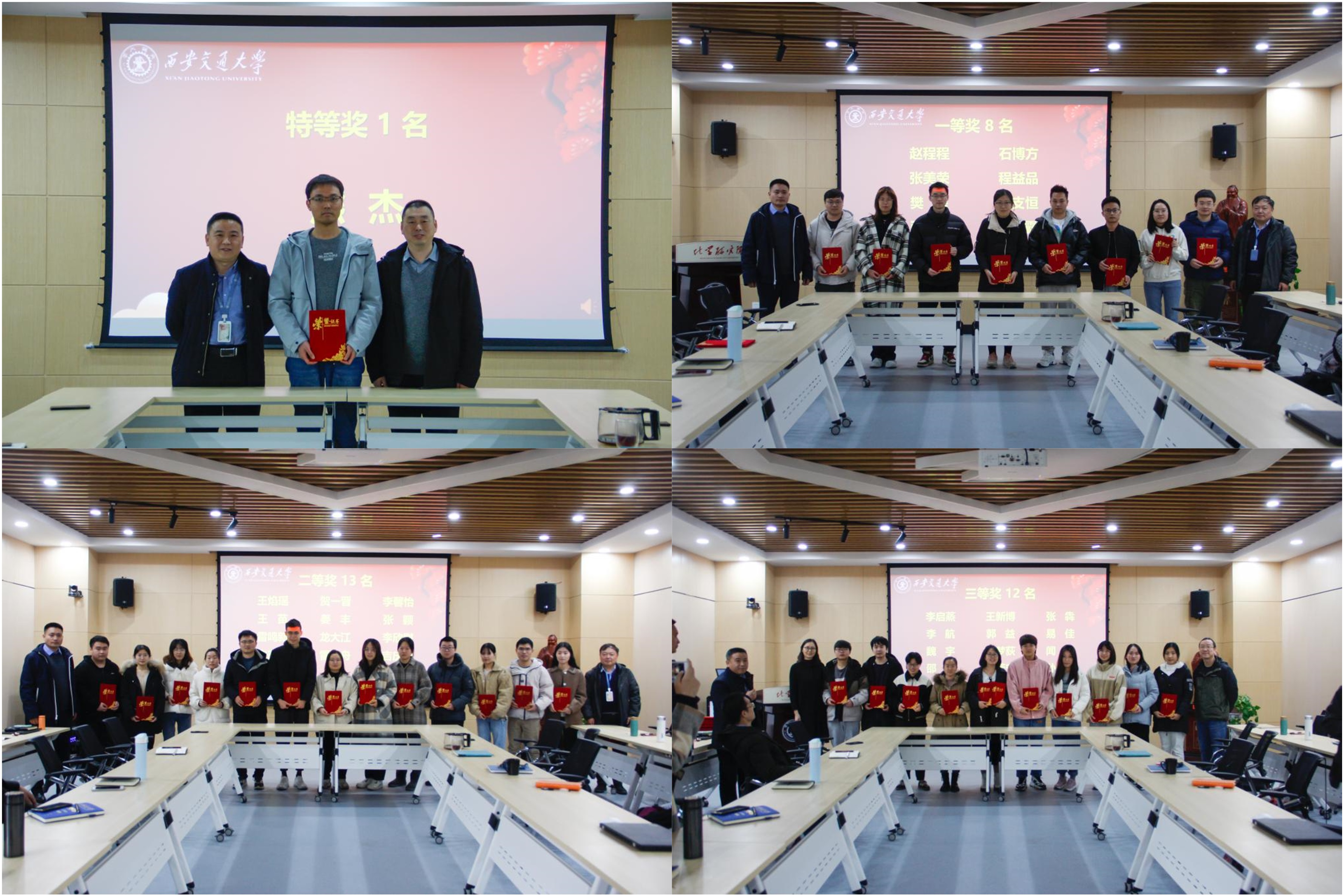 张志成书记和丁书江院长为获得特等奖的熊杰同学颁奖,熊杰同学发表获奖感言,对辛勤培育的导师表示崇高的敬意。他表示,今后要以更高的标准严格要求自己,将感恩作为对自己的激励和鞭策,以认真严谨的求学态度继续努力学习,坚持钻研和探索,取得更加优异的成绩,回报社会,成为为国家的建设和发展有用的人才,也鼓励课题组的同学们都能继续努力,共同进步。赵程程等8名同学获得一等奖,王熖瑶等13名同学获得二等奖,李启蒸等12名同学获得三等奖,学院领导及课题组老师为获奖学生颁奖并表示祝贺。