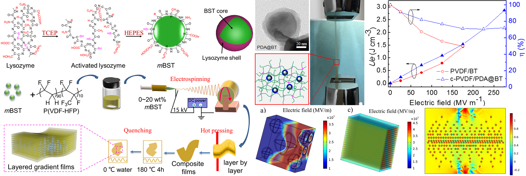 通过聚合物的分子设计与合成、无机粒子形貌及表面改性,在两相之间构筑不同作用力(范德华力/氢键/共价键),揭示材料间的耦合作用机理及性能演化规律,阐明构效关系,提升电介质击穿、储能性能,明晰材料极化行为以及能量损耗的来源组成等基本理论,探索均一结构复合电介质的规模化制备工艺,获得冲击工况下具有高击穿场强及高储能密度的实用电介质材料。