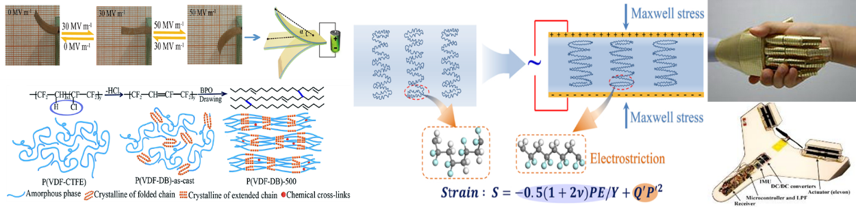 研究含氟聚合物的机电转换原理,通过合理的分子结构设计,实现低电压下发生大应变的电致形变材料,以期应用于人工智能、机电驱动等领域。