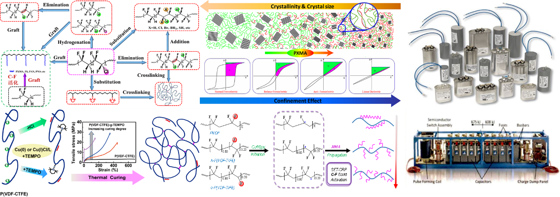 聚偏氟乙烯(PVDF)基氟聚合物因具有优异的耐化学腐蚀性、耐热性、抗老化性、耐候性及耐溶剂性等而在诸多领域都有着广泛的应用。PVDF基氟聚合物具有较高的介电常数,自其压电性及随后的介电、铁电、热电性能被报道以来而被广泛地应用于电磁轨道炮、电磁弹射器、高分辨率声呐、高灵敏度传感器等国家重大需求。本团队的研究领域主要为新型氟聚合物的设计、改性方法、氟聚合物材料的结构-性能关系与调控研究、电活性氟聚合物及其在高储能电容器、传感器等领域的应用、新型高储能聚合物电介质材料的可控合成等。
