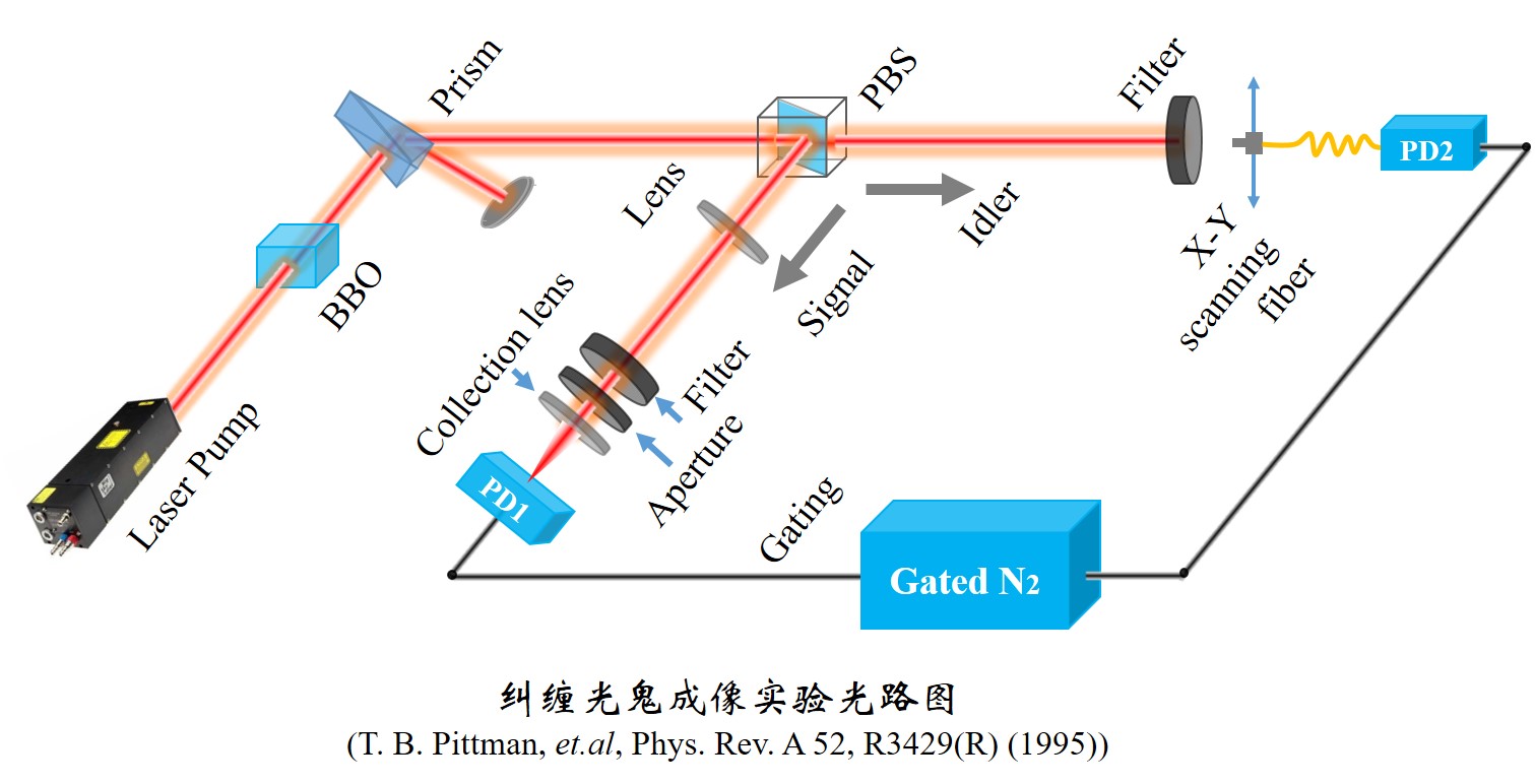 鬼成像,也叫关联成像或符合成像,是指利用光的多阶关联进行的一种新型成像方式。在二阶鬼成像中利用两路信号对物体进行符合成像,其中一路是一个点探测器,它可以探测到光透过物体或者被物体的射的光的强度;另外一路则是具有空间分辨率的探测器(例如CCD),它可以探测到未经过物体的光场的空间分布。这两路信号任何一路都不能对物体成像,只有将这两路信号进行符合处理才能得到物体的像。