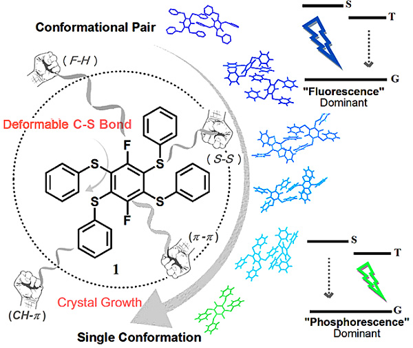 固体发光材料在现代光电子学领域十分重要,特别是晶体状态的发光材料。最近,晶体诱导的发射研究已经取得了重大的进展,研究人员在发光颜色调控、提高发光效率和发光器件编织等多个方面展开了深入的研究。有机荧光-磷光双发射材料是最近兴起的一种发光材料,能够在晶体状态同时产生荧光和磷光发射,这种现象是基于激发单线态和三线态的竞争效应产生的。然而大多数文献报道的这类分子展现的是稳定的荧光和磷光发射,两者比例可调的材料种类比较少见,主要是因为大多数分子缺乏多重的分子间作用力,故常常只能导致构象或者堆叠比较单一的晶体排列,但构象和分子间堆叠的变化恰恰是分子发光性质调控和变化的前提。
