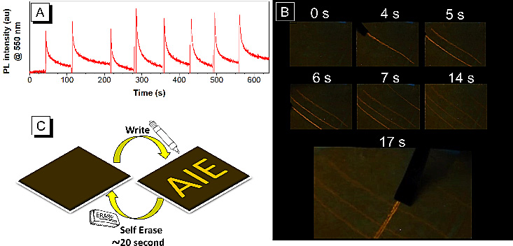 图1. A)划动点亮荧光以及随着时间荧光强度逐渐降低。B)图片展示划动导致的荧光点亮与“自擦除”现象。C)图示写入与擦除过程。