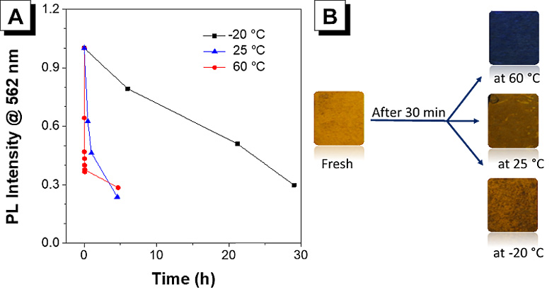 图2. A)不同温度下薄膜发光强度随时间的变化。B)新制备的薄膜与放置30分钟后的薄膜在365 nm紫外灯下的荧光照片。